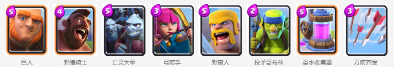 在这套卡组中我们不难看到,这个卡组的核心是圣水收集器,然后反击赚费,在来一波流,这样的套路,在卡组中,每张卡牌都有对应的防守反击的卡,比如野蛮人对付别人野猪和巨人,亡灵大军对付别人的气球和龙宝宝,利用这两张卡,来形成一波流的套路,防守后,配合野猪和巨人的肉,在加上最后方的远程输出,达到一波很难防守的进攻。