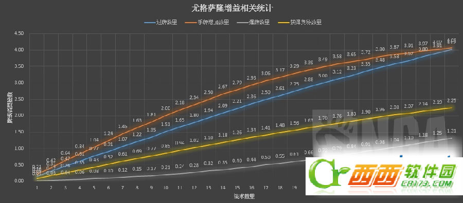 3、法术增益曲线自然直,相当的平稳,因此可以简单在组牌时算到大体的收益。