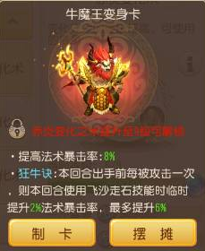 牛魔王变身卡:自带8%的法术暴击几率。让本身就爱暴击的魔王寨更容易暴击了。游戏里高级法术暴击的兽决的暴击几率是15%.而单一张触发狂牛诀牛魔王变身卡的暴击几率就能达到恐怖的14%!!再加上角色自身装备及法暴携带的暴击几率。魔王寨兄弟就像脑门上拍了一本加强版高级法术暴击兽决一样!在那秒啊秒的秒个不停!想想都恐怖