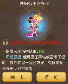 铁扇公主变身卡:基础属性提高法术伤害结果的10%。也就是你本来秒1000的就能秒1100了。是兽决低级魔之心的效果!这类卡的好处在于对输出数据有明显的加成。不用去看人品的触发暴击吧。因为卡片技能增加魔王寨的魔王降临合召唤印记回合次数。相对于龙宫而言这张卡更适合魔王用!