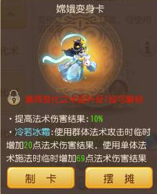 嫦娥变身卡:基础属性跟铁扇公主一样。应该是铁山公主卡片的加强版!加强版低级魔心!卡片技能冷若冰霜又同时提高的角色群体和单体法术的伤害结果。这张卡片适合魔王跟龙宫还有其他5魔辅助秒的时候用!