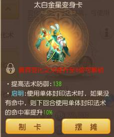 太白金星变身卡:基础属性自身等级*2的法术防御!最近打剑会有种感觉,方寸很怕第一回合就被对战方的法宠推死!所以都建议方寸卡3-4颗法防石头。应该说这次变身卡的推出狠狠的打击了法宠!方寸变身太白以后相当于自身增加了2颗满级的法防石头!想直接靠法宠推死方寸是不太可能了!太白自带启明属性.应该是个超级神属性。成功的使方寸告别了连续封几次不中的尴尬局面。一次不中就能提高10%的封印命中率。下次封就好比你带着十几件封印命中的装备去封还能不中?再不中就在加10件!一直到你能封中!我感觉太白卡极大的提升了方寸,应该会作为FC以后PK唯一的神卡出现在场上!