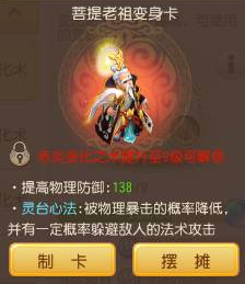 菩提老祖变身卡:相对于太白金星卡,菩提老祖变身卡就显得有些无用了。增加的等级*2的物理防御。卡片技能灵台心法:降低物理暴击,躲避法术攻击。这样看来又是比较拼人品的卡。方寸已经看脸这么多年,这张卡就是让方寸继续看脸了.......当然这张卡也适合其他辅助带带,比方普陀啥的