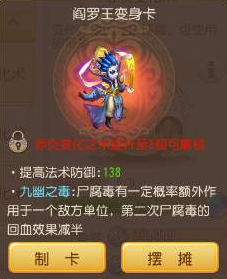 阎罗王变身卡:真是阎罗出三界动,前面导演说方寸的时候说到最近法宠有点狠。封系跟辅助都尽量忘自己身上卡翡翠石,地府也不例外。阎罗王变身卡自带角色等级*2的法术防御。使地府不再用为法防而担心了!而卡片技能九幽之毒,让地府又有了毒两次的机会!毒两次!又让导演这个小普陀的玻璃心痛了起来!阎罗变身极大的提升了地府的生存能力跟治疗能力!可以作为地府PK用卡的不二选择了!
