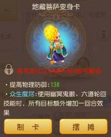 地藏王变身卡:自带角色等级*2的物理防御。虽然现在堆物防的少。但是能加这么多,也是狠不错的了。卡片技能众生度尽:增加鬼眼、六道一回合的效果!因为地府技能多,需要放特技等等。多出一回合的操作也是不错的。当然相对于阎罗王卡,显得有点无力了!