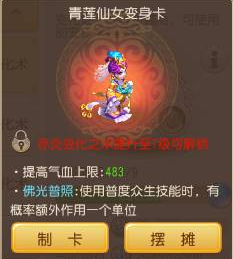 青莲仙女变身卡:卡片自带基础属性角色等级*7的气血上限。卡片技能佛光普照:使用普度众生技能时,有概率3灯。这个应该是大家一直吵着想要的技能吧!地府有阎罗,普陀有青莲。不过导演更喜欢法术防御....多希望这个卡片自带属性是提升角色法术防御呀!青莲的卡片技能不比阎罗的差,就是感觉自带属性不是普陀想要的,因为现在普陀很少有人加血呀。主要都是加速了....虽然有点尴尬,但是总算是有3灯的机会了,还是不错的!