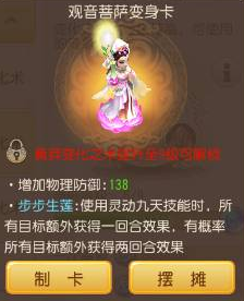 观音菩萨变身卡:卡片自带基础属性角色等级*2的物理防御。卡片技能步步生莲:增加一回合灵动效果,有机会额外获得两回合的灵动效果!导演注意到额外这两个字!按照字面意思是,当普陀变身观音卡的时候灵动会自动增加一回合,在这个基础上又有机会能额外增加2回合的灵动效果!如果是这样那就比较狠了!就拿90级普陀来说现在灵动一次有6回合的效果。如果变身观音触发额外两回合的话,一个灵动就是9回合的效果!直接给普陀多出3回合的操作其他特技法宝技能的时间!有此神技无论魔王强还是龙宫强,谁敢不带普陀?