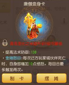 唐僧变身卡:卡片自带属性角色等级*2的法术防御。 卡片技能金刚怒目:死队友加10点愤怒。这个应该是唯一一个能增加愤怒的卡片。普陀,地府,方寸都可以用!踩塔外加死两个队友的情况下。再加受到伤害。变唐僧卡基本上2回合一个大特技。当然要是队友死这么惨,就是能加这么多的愤怒作用也是及其有限的。这张卡片的价值应该在以后的实战中慢慢发掘,毕竟加愤怒的东西都是好东西呀!