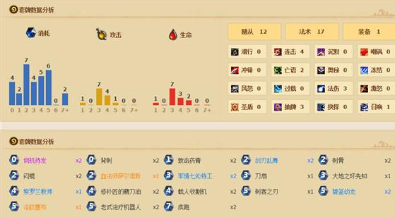 打法:这套牌不同于以往的奇迹贼,所以前期的操控比较重要,打法与之前的中速猎十分类似,前期,不要一下子把随从铺上去,而是一轮一轮的,每回合下一个随从,用法术解对面随从,一边占场,一边解场,然后加基森刷牌,凑齐斩杀之后一套。其实在很多对局中,根本没有用上刀油,只靠清场、铺场、过牌,已经把对方消耗的差不多了,这就是为什么刀油和乱舞只带了一套的原因。
