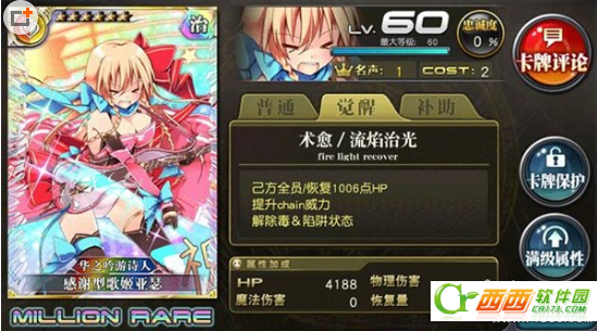 感谢型歌姬,虽然乍看之下这张卡的治疗量堪称捉急,但是有一个chain威力提升,配合治疗量buff也还算好。当然重点是群解毒+群解陷阱,尤其是群解陷阱没有平民卡且群解毒的活动卡本身治疗量也相当捉急。基本上可以说是任何有毒或者陷阱状态的boss都是最强的对策卡没有之一,并且卡面十分喜感且华丽。