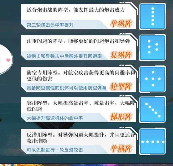 单纵阵:适合炮击战阵型,能最大发挥炮击威力。提升攻击能力,降低反潜能力