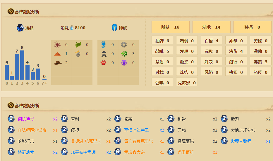 暗影打击:我俗称它为“大背刺”,群友很多想知道,为什么带他,我就多说点。最开始我是不看好这卡的,实际应用中,也是类似背刺,有时挺卡手。多数情况我起手是不留这张卡,只有打那种我可能浪费伤害去解生物的英雄职业卡组,我才选择起手考虑留。比如萨满的234。这卡的作用,主要是为了中后期的时候,一发打出解个4血的克苏恩334,或者解大帝等等,可以省一个刺骨。其次,是因为我卡组的构成,删去了毒药,就略微少了点解,所以带他补充。再次则是为了平衡法术和生物的卡组比例,以往的蓝龙贼,都是法术量大于生物6张左右,这卡组是差不多各一半。但是因为有匪贼和毒心这2种卡,补充了低费法术刷牌,妈妈再也不担心缺法术刷牌,就怕抓不到加基森TOT。至于大背刺打脸,目前我从未实现过,所以略过吧。