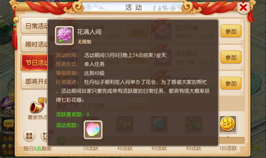 如果你想要给自己放一个轻松假期,那么天女散花活动就是你的最好选择。从5月3日~5月18日,牡丹仙子会在三界不断撒下牡丹花灵来感谢玩家,只要你是等级≥50级的玩家,即可通过单人拾取或者完成日常活动来获得牡丹花灵,并使用花灵来获得在花会期间错过的经验;如果你没有损失经验,也可以分解花灵来获得银币奖励!每人每天只要完成100点活跃度就能获得5朵牡丹花灵,而如果能在活动期间每天坚持完成日常任务,那么奖励将是非常可观的哦!