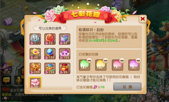 还记得在曾经的众里寻花活动中,为你送上的牡丹花称谓标识么?如果你在之前活动中,曾经与它失之交臂,你现在就可以弥补这一遗憾了!从5月3日~5月9日,只要你是等级≥40级的单人玩家,就可以前往送宝童子处用花瓣值兑换各种奖励;这一次送宝花童更是为你带来了牡丹花称谓前缀标识!要注意的一点是,送宝花童只会在整点时刻才出现,而每次也只会逗留十分钟哦!喜爱这一个性标识的玩家,千万不要错过。