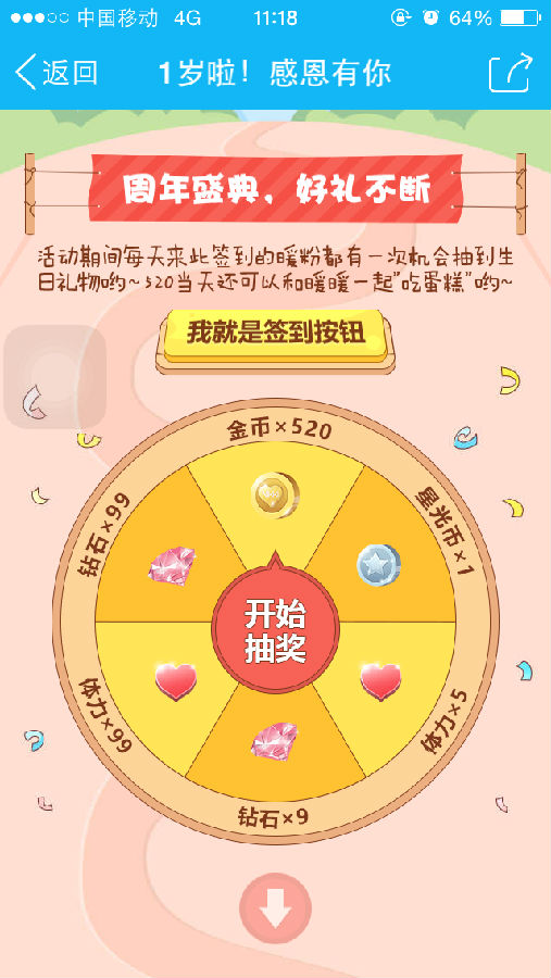 2、点击“我就是签到按钮”进行签到,签到后就能够点击下方的转盘就能够进行抽奖,小编只抽中了5体力呢,祝暖粉们好运