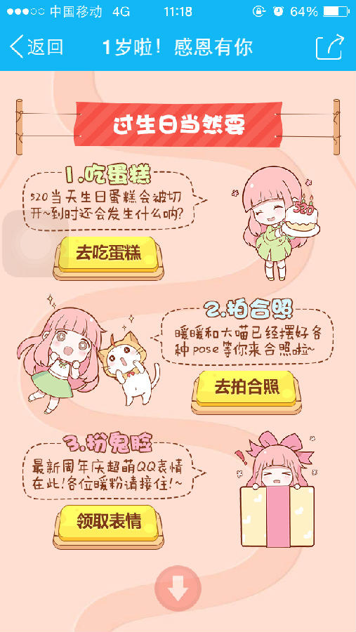 3、吃蛋糕活动将在5月20日开启,拍合照活动将在5月18日开启,扮鬼脸活动将在5月19日开启,能够领取到暖暖的周年庆的表情