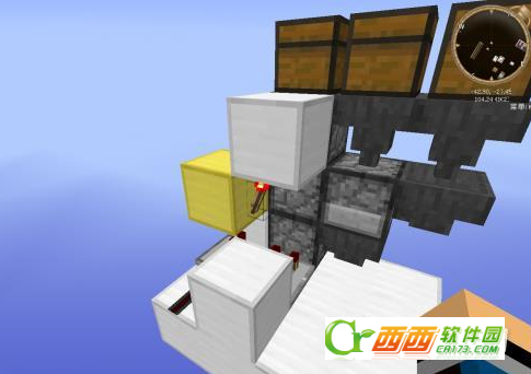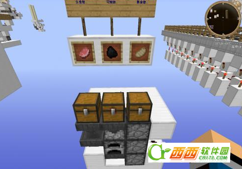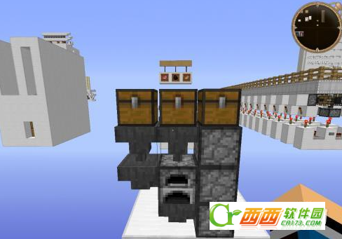 第二步,我们把熔炉和漏斗摆放好,然后把箱子摆放好,如图(下面的漏斗连入最下方的投掷器):