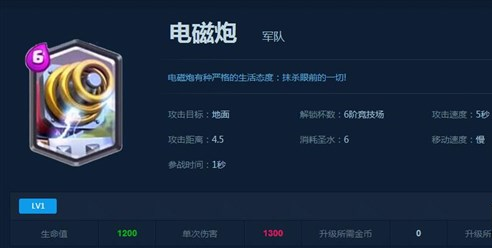 首先从属性可以看到,超高攻,自己会缓慢移动,可以看出防御电磁炮会是非常艰难的,而且费用只有6点,该说什么好呢~就是厉害。不过好在本身的血量并不算很高,1级只有1200,此外攻击还需要长时间充能。不过防御起来依然是非常肉痛的,沉底电炮在死前一定可以射出一炮,这样基本就残了。总的来说,电磁炮并非不可战胜,但对手必须忍受每波解电磁炮都有可能亏费的事实,在亏费的逆境中取胜并不轻松。
