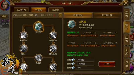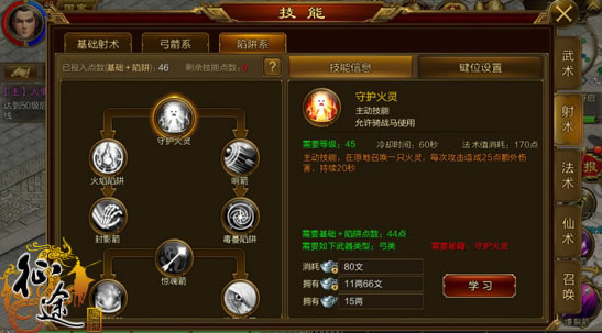 封影箭---x点。(前期单体攻击技能,这个和上面的响箭加一个就可以,加满也可以,主要是凑数,PK主要是以后的技能。前期你不想PK吧……)