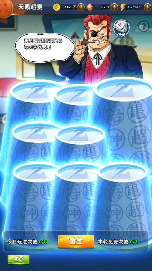我们可以看到9个杯子是随机打乱了的,想要获得超赛并不算太容易,当然我说的是一次猜对的几率。每多猜一次,都需要花费龙石,龙石的花费依次递增,从10龙石到90龙石一次不等。但是,目前超赛孙悟空的获得渠道除了V礼包暂时就有这一个方法,想要获得超赛孙悟空要么就是耐得住寂寞,要么就是咬咬牙多投入点龙石了。