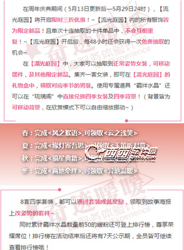 奇迹暖暖的新版本马上就要更新了,这次的版本更新改动非常的多,将会出很多的新玩法,其中流光庭院就是一个新的玩法,流光庭院将出四季套装,春夏秋冬各一套,而且是男女两套噢,女装获得之后就可以领取男装了,下面小编就来给大家介绍一下奇迹暖暖流光庭院春之套装风之絮语云之浅笑获得方法以及春之套装鉴赏!