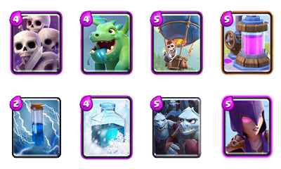 卡组均耗4.3,但是我们不要在意这些细节,我们主要看的是卡组的构筑中有5张紫卡,其中女巫冰冻和气球三个是关键卡我们不考虑替换,飞龙宝宝条件不足可以换成法师,而条件富裕则换成冰法师、公主,骷髅军团条件不足可以用骷髅兵、哥布林凑合一下使用,而条件富裕一个矿工也是挺好的。
