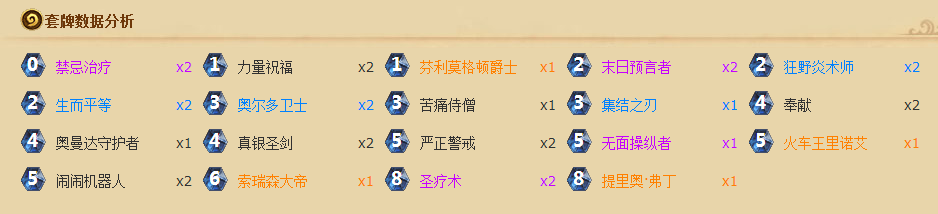 这是一套完美针对目前天梯环境的高胜率打脸圣骑士卡组,从某种意义上来说也属于自闭卡组,通过圣骑士茫茫多的控制手段(如果手里有很多控制手段优先使用效果较弱的)与对手周旋,消耗对手的手牌,用高奶量抵消对手的伤害输出,最后通过OTK手段终结对手。