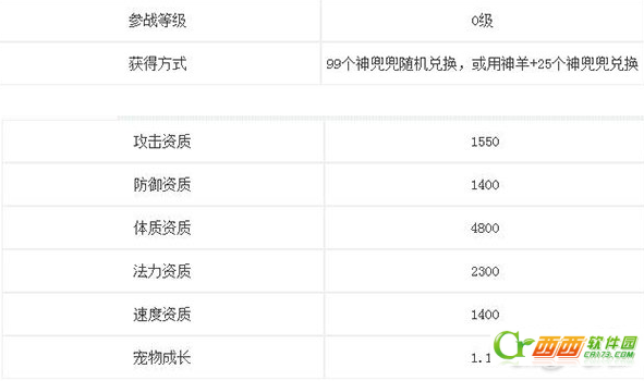 体质资质:+200 法力资质:+100 防御资质:+20 攻击资质:+50 速度资质:+20 成长:+0.04