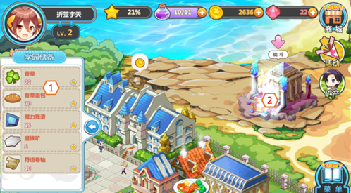 [9]、资源标识:地区内产出资源的建筑,可以通过雇佣工人和手动挖掘的方式来获取学园无法生产的资源。