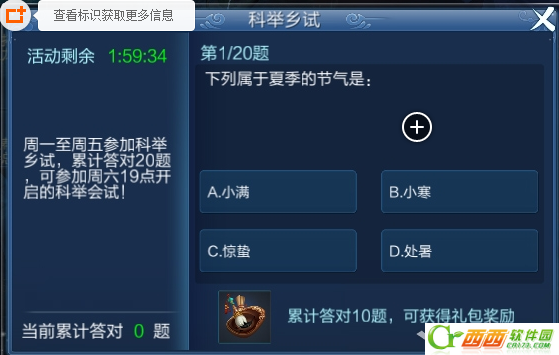 周一至周五,每天晚上可回答20道科举题目,如果大队10题,可获得文房四宝礼包奖励。
