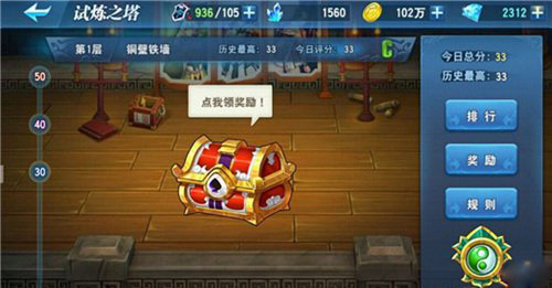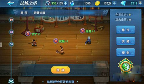 试炼之塔中,玩家需连续挑战关卡,每通过一层则该层将显示宝箱奖励,并解锁下一层关卡。若一个难度下的某一关卡玩家已达到S级评分,则当该关卡可再次挑战时,玩家可以该S评级的分数直接扫荡该关卡。