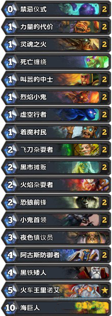 在WOG版本之前,混合术曾经在天梯中风行过一段时间。INER在赛事中使用的新版混合术依然保留了灵魂火、火车王作为斩杀手段,为配合术士的快速铺场而放弃了混合术常用的碧蓝幼龙,增加了1张海巨人,节奏对比起老版更快。