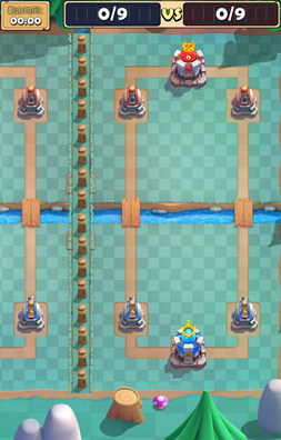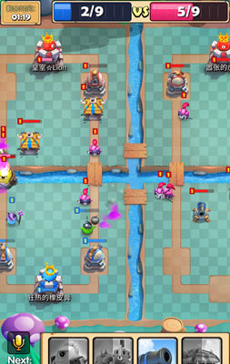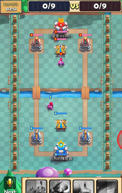 4、游戏进行到一个阶段后,会开启全部入场模式,当你推掉了对手后,你可以直接在其他场地投放兵力,帮助你的队友进攻对手。这里要注意的是,在比赛结束前,即使你对面的对手已经没有国王塔了,他依然可以攻击你,所以千万别掉以轻心。