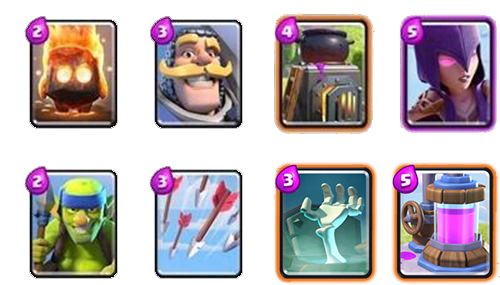 兵营类卡组的玩法就是前期靠一两个兵营产出和对手进行消耗,后期靠大量的兵营一波推掉对手的基地。所以具体的玩法并没有什么特别的,特别需要说明的就是女巫的定位,在这个卡组中骑士和女巫是一个核心组合,他们可以有效地站住对手的半场给后续人海有机会进攻。