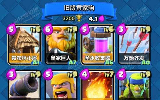带采集器那套就是很多土豪前段时间在用的爆款黄家驹卡组了。 由于采集器的进一步削弱,和墓碑的加强。最近自作聪明的把采集器替换成了墓碑(不过必须要说采集器依然强力!)。墓碑相对采集器优势有:更适合防守: 猪、大炮车、黄家驹、全明星、矿工等。 主要缺点就是,没有采集器你慌不慌?