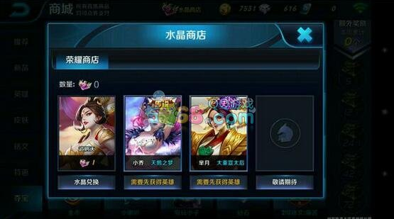 上图便是水晶商店,目前有武则天英雄、小乔天鹅之梦皮肤、芈月宣太后皮肤。