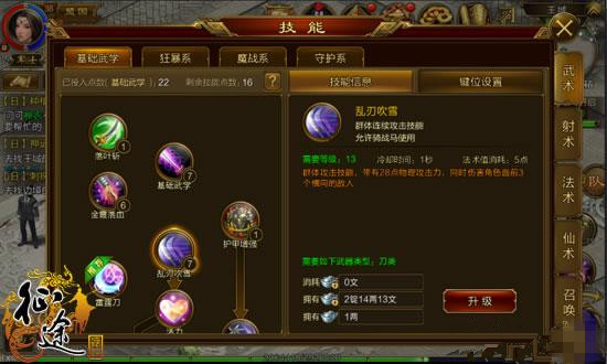 乱刃吹雪:群体攻击技能,满级带有28点物理攻击力,同时伤害角色面前3个横向的敌人,1秒冷却时间,是前期做任务主力输出技能,刷怪速度很快。