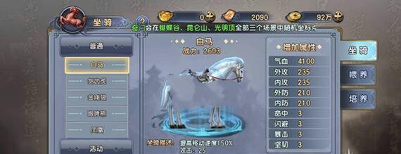坐骑可以直接提升我们角色的属性,并且坐骑也有优劣之分。白马是最基础的坐骑,也是最弱的坐骑,会自然得到。而后面的如凤凰、咆哮熊这些坐骑则不容易得到。但是基础属性很强,可培养性也很高,可以大大的提升人物的属性和战斗力。