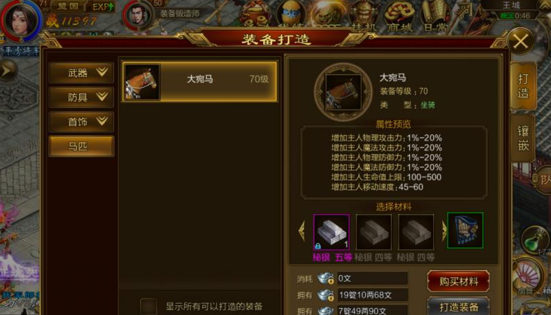 打够十个碎片之后,小伙伴们就可以前往装备锻造师那里进行锻造啦。打造大宛马的材料要求是,三个五等银加上十个马铠碎片。当然,如果觉得打马铠碎片太辛苦的小伙伴们还可以上拍卖去买哦,总之,土豪请自便啦。