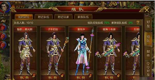 既然是团战,那么第一步就是要选择合适的队友了。不删档队伍人数最多可以是10人,组队经验有75%的加成,如果是家族组队,还有额外加成。组队的玩家 职业上最好能够平衡,刀、扇、棍、杖、弓的比例要合适。最佳的分配是每个职业2个。由于当前玩弓的玩家比较多,所以提前联系好经常玩的刀、棍这种比较少的 玩家,是打小型团战前的必要准备工作。