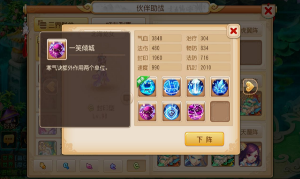 壁水貐(芙蓉仙子造型),主獅駝四分之一血召喚,四封印五法。主是狮驼面伤能力较强这还不是重点,重点是主那排的怪有四个会封印的童子,收拾起来颇为麻烦。所以在这里强烈建议北海龙女的封附带一笑倾城可以封三,封起来速度很快。主没什么难度,先不集火控制血量第二回合再收它的人头。