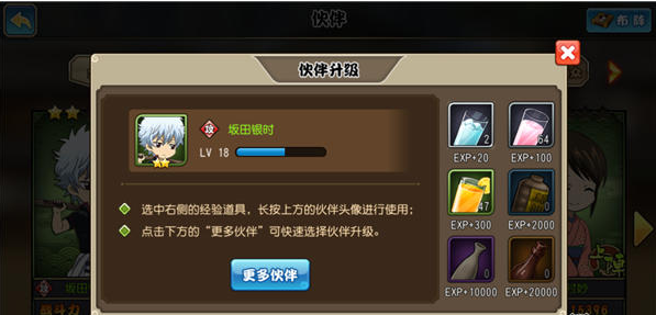 伙伴升级主要是通过对伙伴使用糖水、果汁、牛奶等材料,可以为伙伴提供大量的经验值加成。另外副本通关也有一定的经验值加成。主线任务和勇者大乱斗是得到经验材料的主要地方。