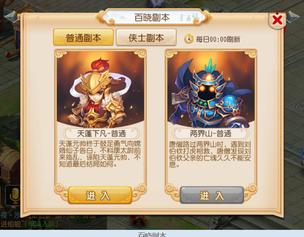 百晓副本分为普通与侠士两个难度,普通副本每天可以完成1次,侠士副本每周可以完成一次。需要注意的是侠士副本是十分难得哟,请大家搭配好阵容,再去挑战。