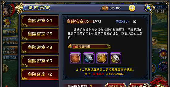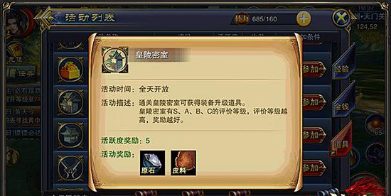 想要每日获得更多的皮料和原石,增加我们进入副本的次数无疑是最佳选择。皇陵密室一共分为5个等级,分别是24级、36级、48级、60、72级,难度不同,掉落的材料等级也不同。我们每天仅可以参加皇陵密室1次,而且每次都需要消耗10点体力值。值得注意的是,贵族3可以增加2次机会,个人建议大家可以提升贵族等级,性价比极高。
