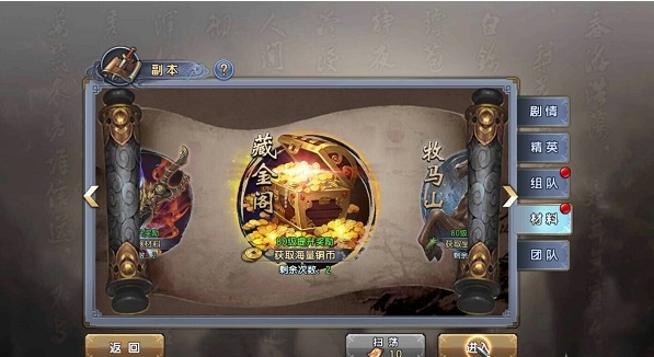 铜币副本,又叫“藏金阁”副本,是游戏中获得铜币的主要来源之一,重要性毋容置疑。每位玩家每天可进入2次,是的你没看错,只有2次,就算你是VIP玩家都不能多进1次!这样也从根本上拉近了平民玩家和土豪们的差距,真的国产良心啊!