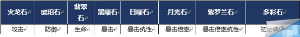 宝石:每件装备最多可以开启4个镶嵌孔。装备被获取时,有一定几率会开启1-4个镶嵌孔。没有开全的孔可以通过消耗钻石开启。不同位置的装备只能镶嵌制定类型的宝石。头盔可以镶嵌日曜石和紫罗兰石,胸甲可以镶嵌翡翠石和琥珀石,护手可以镶嵌月光石和多彩石,靴子可以镶嵌月光石和多彩石,武器可以镶嵌龙火石和黑曜石。
