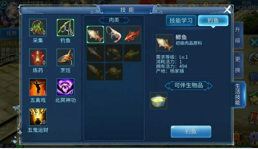 其中传统意义上的生活技能是前四种,采集、钓鱼生产原材料,炼药和烹饪生产成品药和食品。
