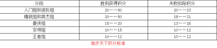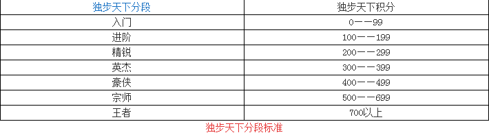 玩家首次参与独步天下,积分都是默认为0,胜利可以赢得积分,失败则会扣除积分,而积分则是确定玩家段位的标准,独步天下一共有7个段位,分别是入门、进阶、精锐、英杰、豪侠、宗师、王者。