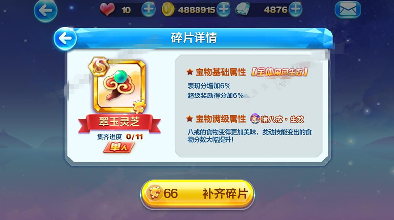 翠玉灵芝需要大家充值获得4个九齿钉耙来获得,也就是相当于15*4=60软妹币的价格,这款宝物是猪八戒的专属S宝物,主要就是针对猪八戒的高分食物的加成。八戒的技能得分就全靠这些高分食物了,所以有了翠玉灵芝的加成,猪八戒的得分同样还是提高了不少的。这款宝物和锄天金耙一样,对于猪八戒来说,都是很有入手的必要的一款宝物。如果大家有这个实力的话,可以选择入手哦。