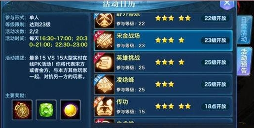 活动介绍:这是一场15VS15的大型实时在线PK活动,玩家在游戏中将会代表宋方或者是金放,然后和本方其他玩家一起去对抗另外一方的玩家。